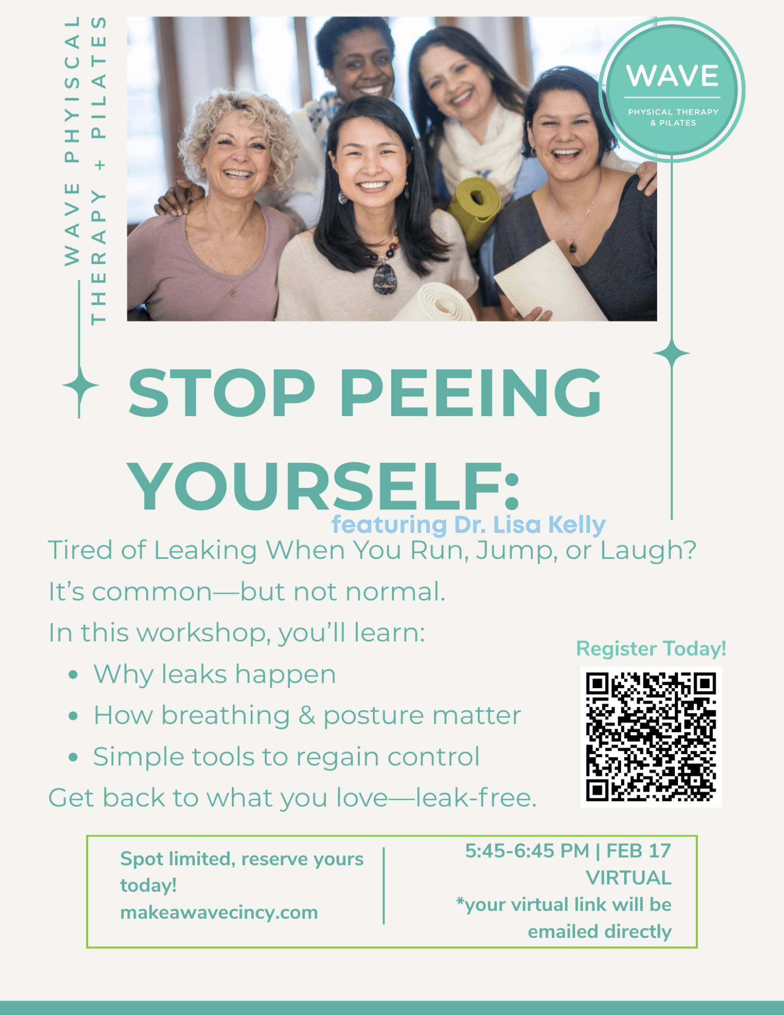 Leaking urine with exercise, laughing, coughing, or sneezing is incredibly common — but it’s not something you have to live with. Join Dr. Lisa Kelly, physical therapist and pelvic health specialist, for a free virtual workshop focused on understanding why bladder leakage happens and what you can do about it.